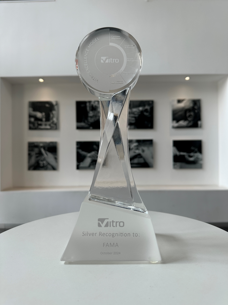 El pasado 3 de octubre, durante la 6ta edición de la Convención del Modelo de Excelencia Vitro, se presentaron los avances y resultados de las evaluaciones realizadas en las diversas plantas de Vitro. Nos enorgullece anunciar que FAMA, recibió el reconocimiento de Plata por haber alcanzado el nivel de estandarización en nuestros sistemas.